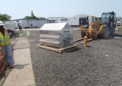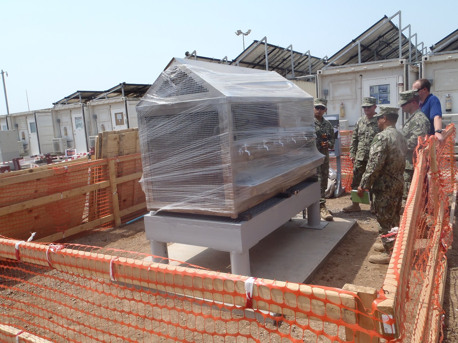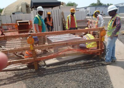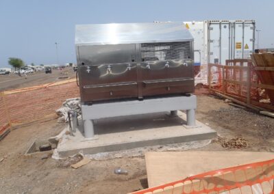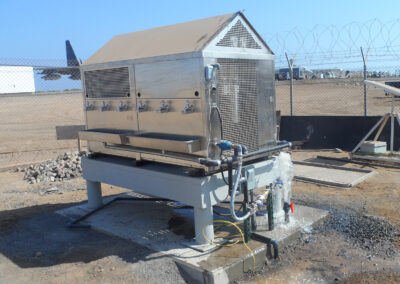 Design/Build: Install Filtrine mobile chillers at various locations throughout the camp. Work included the installation of the chillers, electrical connections, water and waste lines as well as the installation of 6′ x 8′ 6″ reinforced concrete pads, fabrication and installation of steel framed pedestals designed to support the 2500 LB chillers, and the installation of water meters.